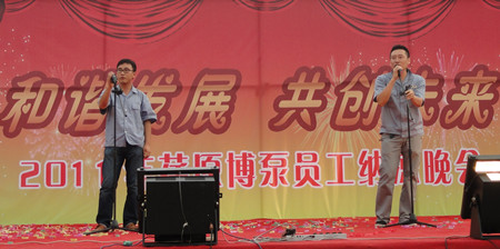 舞蹈《開(kāi)門(mén)紅》寄托著荏原博泵員工對(duì)公司發(fā)展前景的美好期盼,展示了公司女職工的風(fēng)采。20多名復(fù)員軍人用一首《咱當(dāng)兵的人》抒發(fā)了他們保家衛(wèi)國(guó)、貢獻(xiàn)企業(yè)的豪情與壯志;研發(fā)部、技術(shù)部員工帶來(lái)的歌曲《跳起來(lái)》,展示了年輕人的青春與活力;質(zhì)量保證部員工在部長(zhǎng)岳東海帶領(lǐng)下,演唱了歌曲《相親相愛(ài)一家人》,演繹著荏原博泵大家庭的親情、友情。友情樂(lè)隊(duì)帶來(lái)的動(dòng)感十足的歌曲,更是將晚會(huì)的氣氛烘托到高潮。